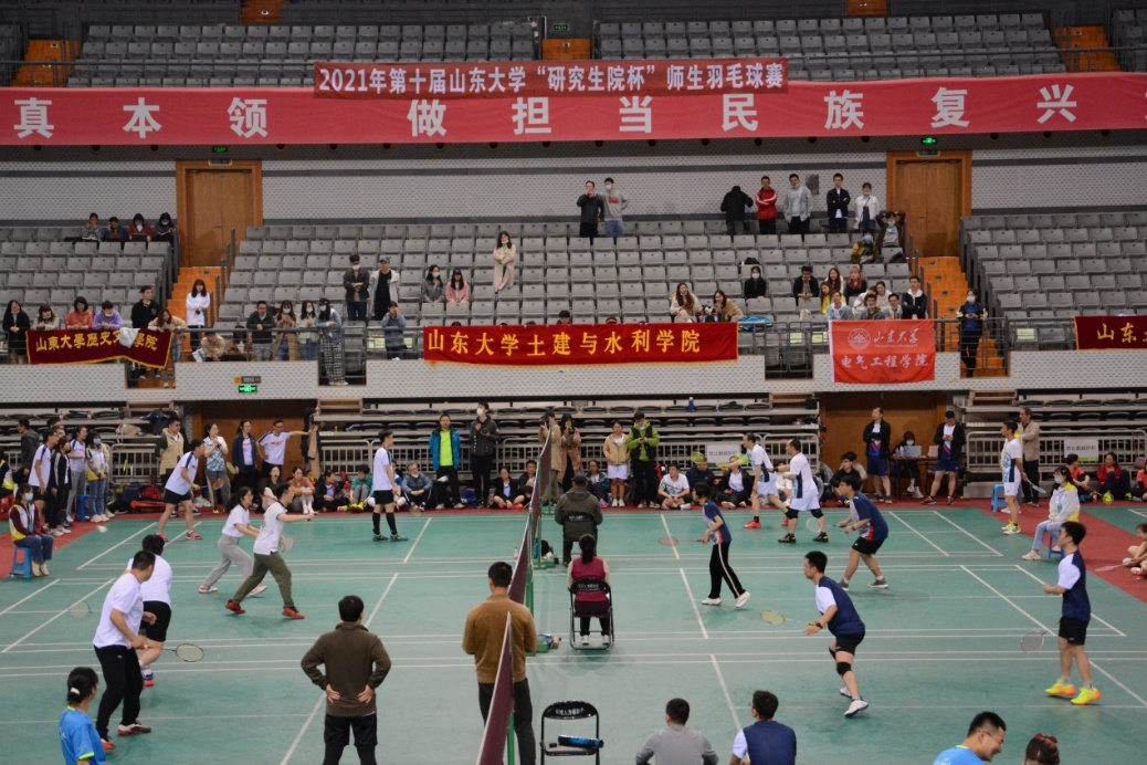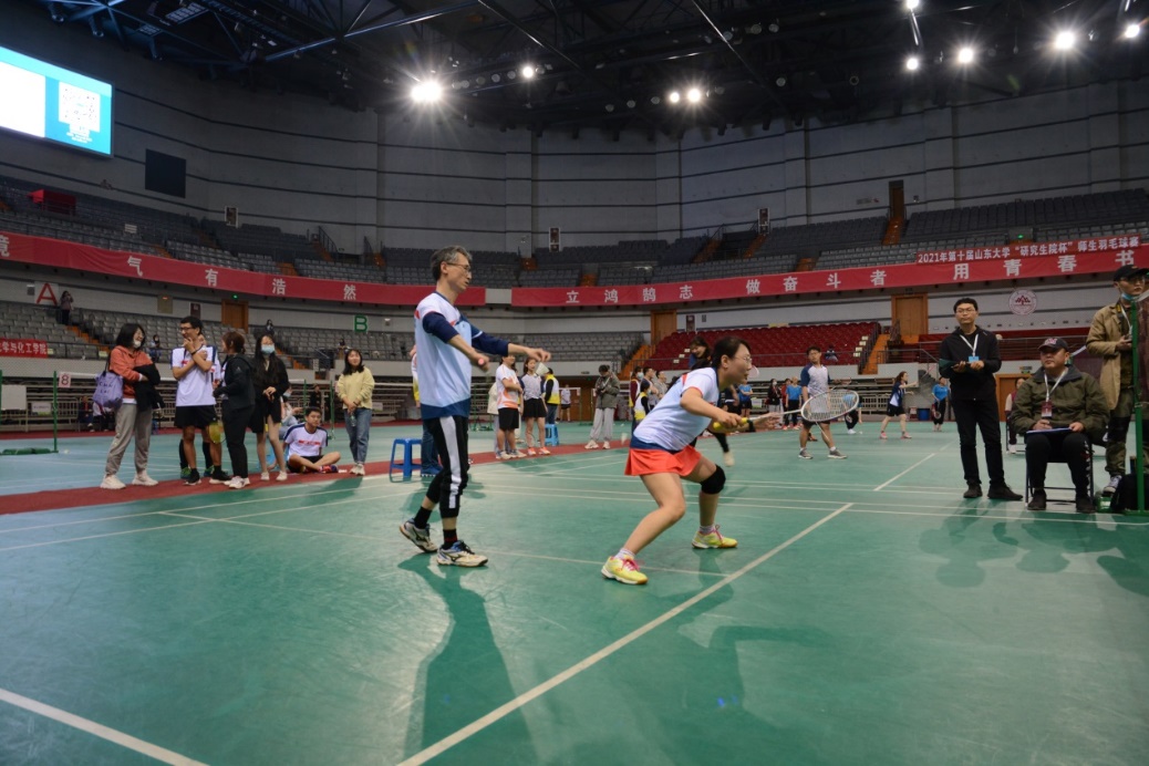 24日上午8点30分,比赛正式拉开帷幕。土建学院依次对阵临床医学院、经济学院和历史文化学院。赛场上激情四射,选手们大展身手!一记记精彩的扣杀、劈杀或是巧妙的高远球、以柔克刚的吊球还有惊险无比的救球博得了观众们一阵阵的叫好声。战况胶着,我院大比分2:1先胜临床医学院,却1:2不敌经济学院。在最后一场与历史文化学院的男双比赛中,决胜局对手14:9比分领先,先拿下局点。陈烨老师和潘旭东同学顶住压力,连得5分将比赛拖入加时,并以17:15的比分战胜对手,赢下男双对决,土建学院大比分2:0获胜。经过一天的激烈厮杀,我院羽毛球队伍以小组第二的成绩成功挺进16强。