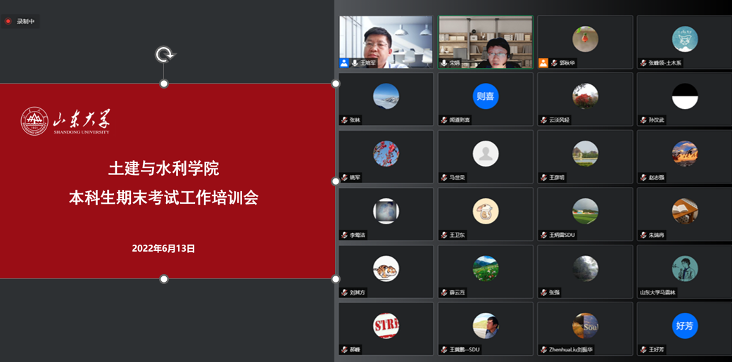 根据学校教学工作安排,本学期期末考试时间为2022年6月20日至2022年7月2日。为保障本科生期末考试工作正常有序进行。6月13日下午,学院召开本科生期末考试暨课程资料归档工作线上培训会。副院长王培军主持会议,副书记张强及任课教师、监考教师、学生辅导员等参加会议。