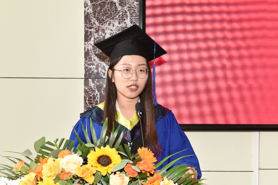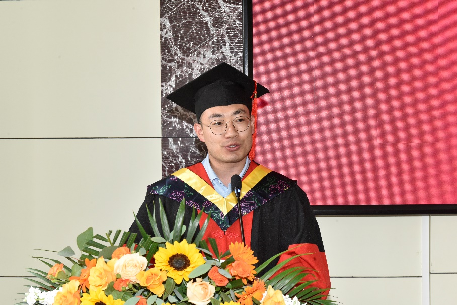 学生发言阶段,孙乐乐和吕泊宁分别作为优秀博士生和优秀硕士生作典型发言。孙乐乐在发言中表示,一要感恩时代与国家,为成长发展提供了无限天地;二要感恩学校学院,为成长发展筑牢了人生根基;三要感恩导师亲友等,为成长发展锤炼了过硬本领,他号召同学们砥砺爱国之心,力践民族复兴之行!吕泊宁在发言中回顾了山大三年流金岁月,分享了自己在导师和同门帮助下从青涩走向成熟的过程,她号召胸怀家国天下之情怀,将毕业离歌化作人生新的奋斗序章!