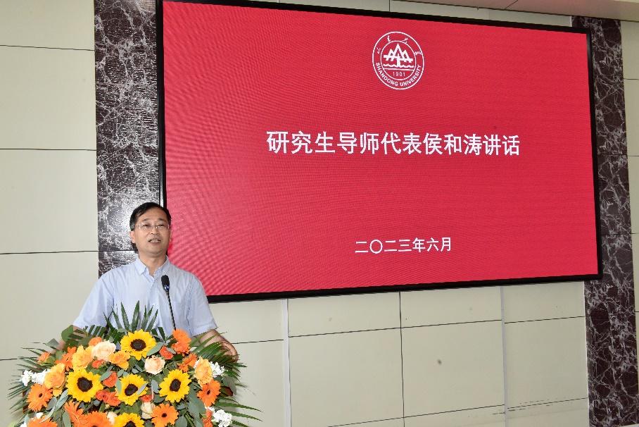 教师侯和涛教授作为导师代表发言,讲话真挚热烈、饱含殷殷期待。他期望同学们:一要胸怀壮志、善抓机遇,表示坚持终身学习和敢为天下先的魄力将是同学们打开未来光辉前程的重要力量;二要求真务实、锐意创新,一线和工程现场是最好的实验室和科研主战场,嘱咐同学们要坚持把论文写在祖国大地上;三要常怀感恩之心,要传承山大基因,将崇实求新的山大校风融入生活点点滴滴。青春不散场,远行勿相忘!他代表全体导师祝福同学们在新征程中激昂青春,争做新时代开拓者!