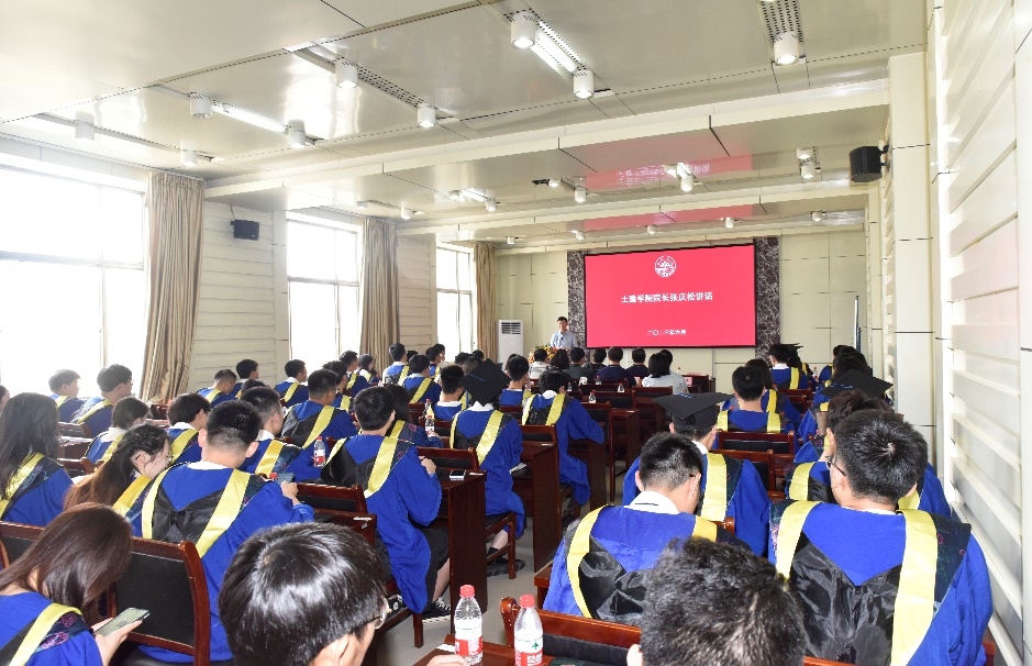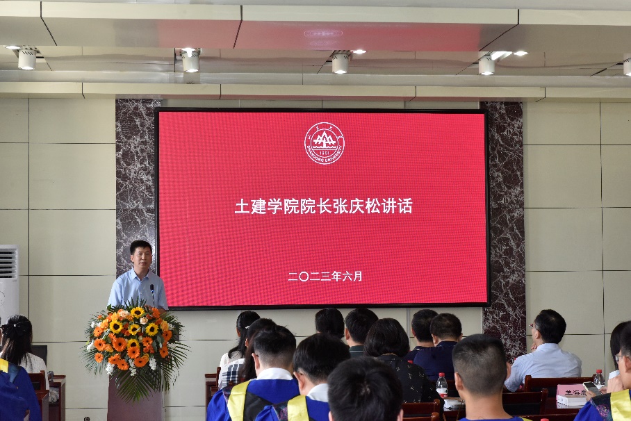 张庆松院长在致辞中代表学院向圆满完成学业的2023届全体毕业生表示最热烈的祝贺,向一路陪伴学生成长成才的老师、亲友们表示最诚挚的祝福,对同学们为学校、学院高质量发展作出的贡献表示最衷心的感谢!在中华民族伟大复兴新征程上、在人生青春华章新起点上,他对毕业生提出四点期待:一要胸怀天下、志存高远,厚植家国情怀、立志常存家国,用使命担当撑起厚重人生;二要开拓创新、勇于进取,在人生漫长道路中要永葆朝气蓬勃、永葆奋进姿态,创新征途永不止步;三要自强不息、不折不挠,面对人生岁月荆棘丛生、坎坷不平,要坚信梅花香自苦寒来,于逆境中顽强成长,唯自强者方能致远;四要脚踏实地、锤炼自我,要顺应时代、融入时代,要将优秀作为一种习惯,在学习工作生活中锻炼出好性格、好品质!最后他表示学院和老师们将永远是大家的坚强后盾,祝愿同学们鹏程万里、前程似锦,在创新的赛道上跑出不负韶华的土建风采。