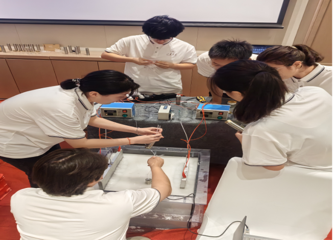 我校参赛队伍是由土木工程系2021级、2022级本科生组成。他们以“四根螺旋型、两根单U型能源桩串并联相结合”为设计理念,将单U型能源桩用作冷水流入预热口,其余能源桩用作主要换热装置,实现了“冷水预热,逐层加热”的循环利用设计方案。这一方案兼顾了传热效率和地表沉降等因素,具有较强的可实施性,又灵活运用了固定模式,使模型更加稳固。本次比赛给团队成员们提供了认识了解能源地下结构的宝贵机会,同时激发了成员们的创新精神,提高了将理论知识与动手实践相结合的能力,让团队成员受益匪浅。