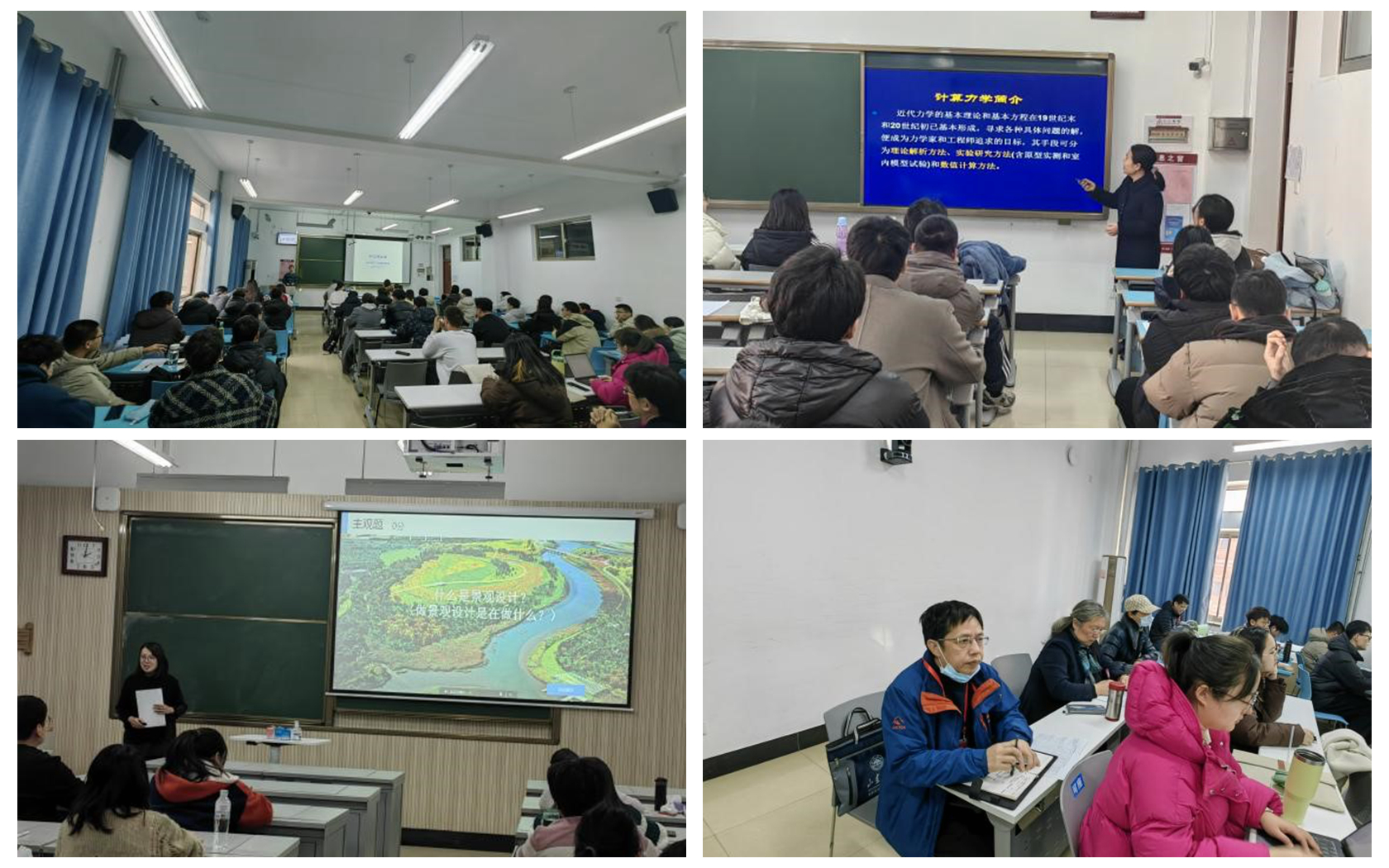 学院一行全程观摩了学院教学督导员刘建华老师的《水工建筑学》、教学经验丰富的王卫东老师的《计算力学》以及青年教师教学比赛获奖者王新老师的《景观设计》。授课老师备课充分、形式多样,注重理论与实践结合、学科教育与思政教育深度融合,并有意识培养学生的创新思维和科学批判精神。课堂气氛活跃,充分展现了学院良好的教学风貌和师生饱满的精神状态。