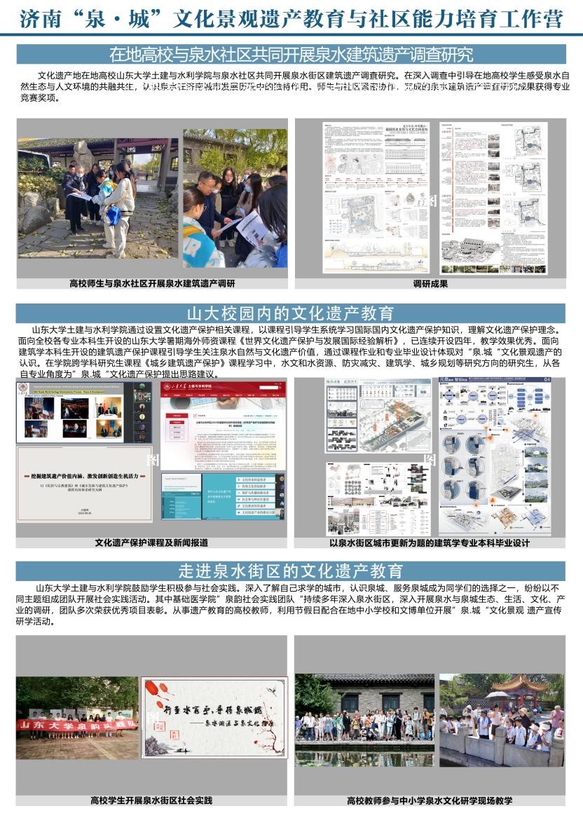 济南市政府于2006年首次宣布泉水申遗,2019年“济南泉·城文化景观”成功列入《中国世界文化遗产预备名单》。188改名为Taptap点点188改名为Taptap点点在“济南泉·城文化景观”申遗工作中积极贡献学院力量。该训练营是土建学院助力泉城申遗的重要途径,通过现场教学、实地调研、社会实践引导学生和社区认识泉水文化景观的遗产价值,让更多人领略济南泉水文化魅力,推动“人·泉·城”的高度融合,在维护文化遗产真实性、历史风貌完整性、社会生活延续性方面积极发挥高校力量。