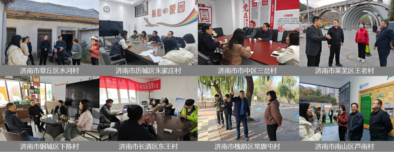 调研组先后来到章丘区、历城区、南山区、市中区、莱芜区、钢城区、长清区、槐荫区、平阴县、商河县、济阳区等11个区县的20余个村庄,进行了实地考察和访谈,详细了解、济南市乡村振兴与城乡融合发展情况。围绕研究课题中关涉的乡村产业振兴与集体经济壮大、乡村人居环境建设、村庄规划编制、农村“三资”确权与“三变”改革、公共服务设施优化配置、乡村既有建筑更新等热点难点问题,与村集体负责人及部分村民进行了实地观摩与现场探讨。