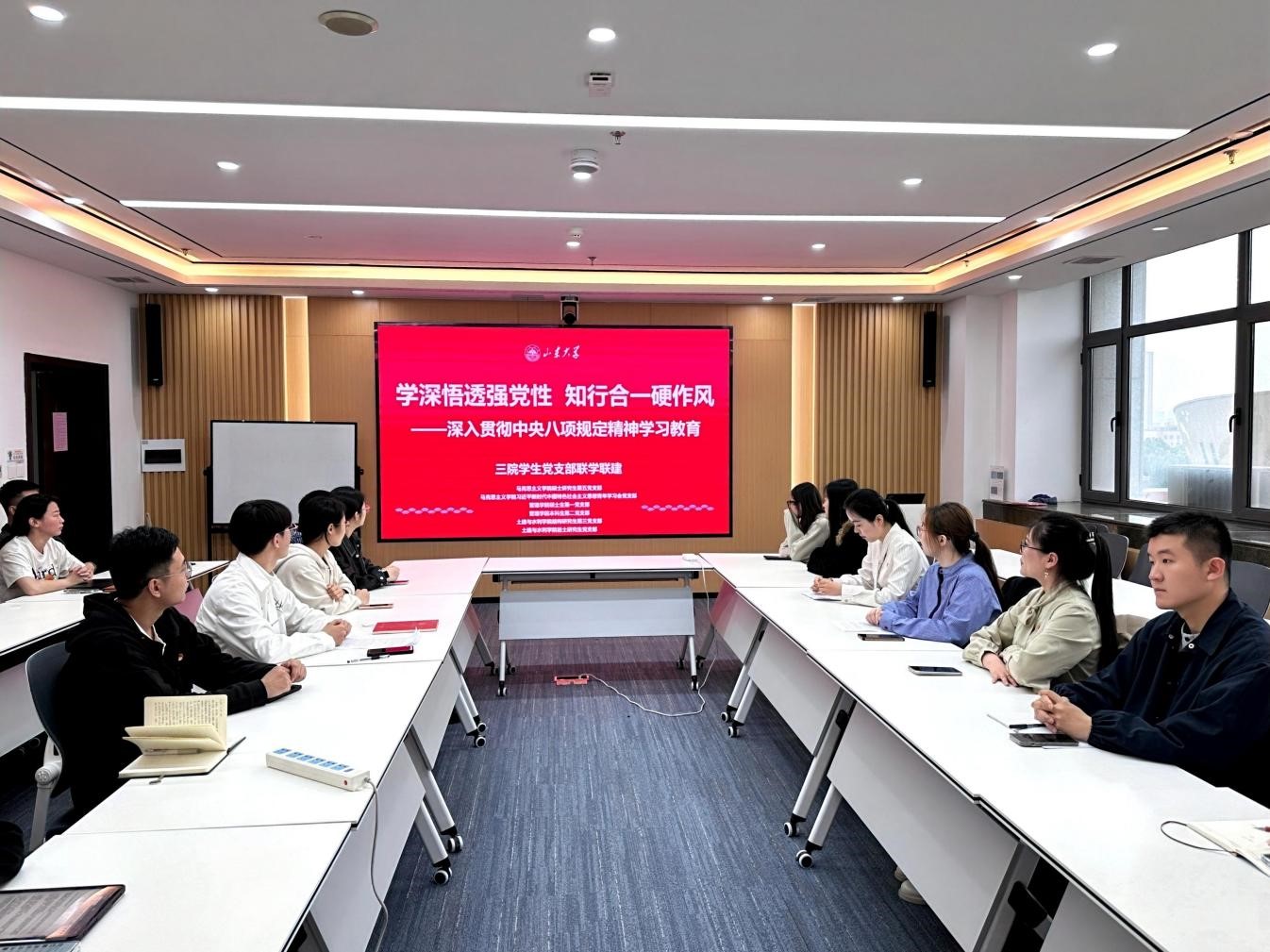 为深入贯彻中央八项规定精神,推进全面从严治党向基层延伸,增强研究生党员的政治定力与纪律意识,4月27日下午,土建学院结构研究生第三党支部、岩土研究生党支部联合马克思主义学院硕士研究生第五党支部、习近平新时代中国特色社会主义思想青年学习会党支部以及管理学院硕士生第一党支部、本科生第二党支部,于188改名为Taptap点点中心校区开展“学深悟透强党性 知行合一硬作风”深入贯彻中央八项规定精神学习教育联学共建活动。