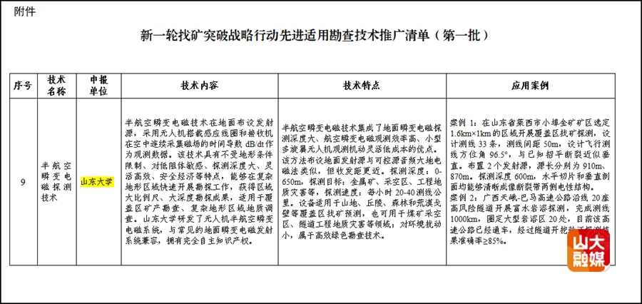 孙怀凤教授团队长期致力于无人机航空电磁探测理论、方法、装备、软件及应用方面的研究,得到了国家自然科学基金、国家重点研发计划等项目资助,相关成果先后于Transactions on Geoscience and Remote Sensing、Geophysics、Engineering Geology、Environmental Earth Sciences、Tunnelling and Underground Space Technology、《地球物理学报》等国内外期刊发表。《新一轮找矿突破战略行动先进适用勘查技术推广清单(第一批)》(以下简称《推广清单》)由自然资源部组织遴选、自然资源部办公厅面向社会公开发布,旨在充分发挥科技创新对矿产资源勘查工作的支撑引领作用,促进绿色先进勘查技术在新一轮找矿突破战略行动中的广泛应用。
