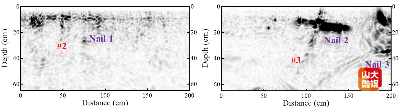 图2 石佛造像内部锯钉和裂缝的成像结果