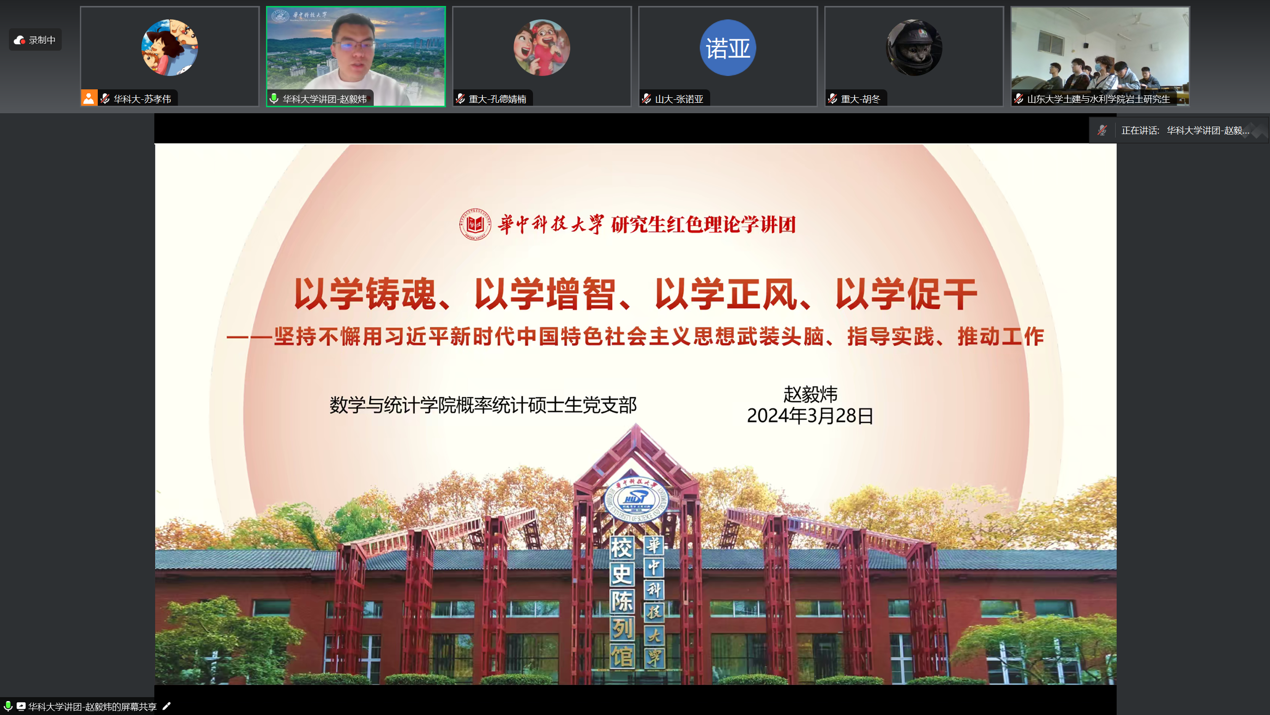 华中科技大学研究生红色理论学讲团讲师赵毅炜受邀参会,围绕习近平总书记提出的主题教育总要求,结合巩固拓展主题教育成果的意见和研究生科研生活实际,分享题为《以学铸魂、以学增智、以学正风、以学促干》的微党课,他呼吁广大青年同志积极响应党中央号召,为奋进新征程凝心聚力,踔厉奋发、勇毅前行。