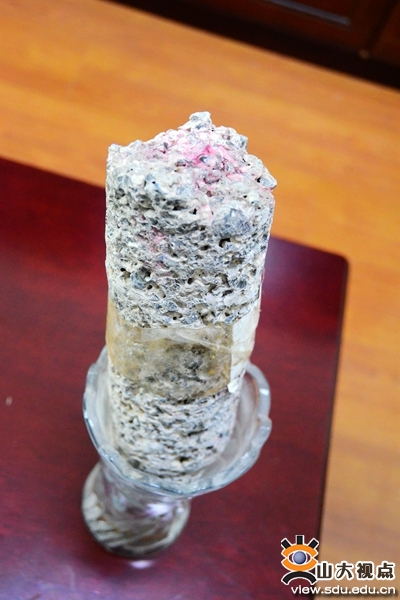 崔新壮教授把这块透水混凝土桩放在办公室,时不时向来人展示它神奇的“透水”功能