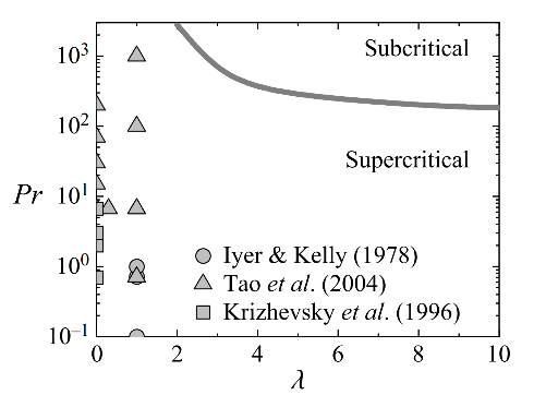 该论文在国家自然科学基金项目的支持下,通过有限幅值展开方法研究了热分层流体中浮力驱动边界层的弱非线性不稳定性。理论分析表明,不同温度梯度比λ和普朗特数Pr对应着不同的分叉模式。当0≤λ<2,Pr≤2800时,流动呈现超临界分岔。与先前研究结果不同的是,当温度梯度比和普朗特数较大时,系统会出现亚临界分岔(图1)。此外,通过剖析朗道系数中非线性项的贡献,探究了平均流的修正项和速度二次谐波与温度线性模态的相互作用,结果表明该相互作用在亚临界分岔中起着重要作用。基于朗道方程,文中对非线性平衡解的阈值振幅进行了讨论。以上这些研究结论将会促进学者们对浮力驱动的流动系统转捩过程的理解。