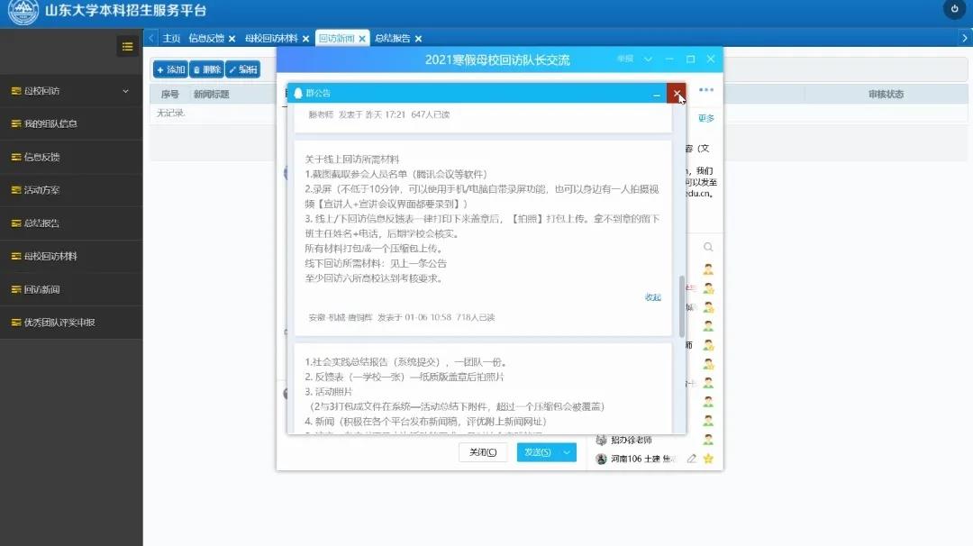 随后,队员们就各自学校的安排分别进行陈述。由于当前环境下较严峻的疫情防控形势,各个学校今年的宣讲安排较往年有所变化。针对此情况,焦志恒提出在新形势下要通过线上、线下多种形式积极宣传我校近年来取得的优异成绩和巨大进步,展示我校学子良好的精神风貌和学习氛围,并将真诚问候和美好祝福送给生源中学。
