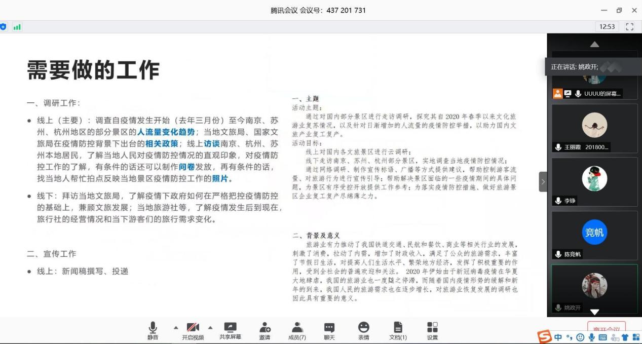 会议开始,陈书婷介绍了本次社会实践活动的背景与意义。疫情蔓延初期,人民活动受限,文旅产业的发展曾一度停滞。如今随着国内疫情形势的缓解和新年的到来,我国人民的旅游需求也在逐步增长。在政府部门的支持下,我国文化旅游业度过寒冬期,迎来了新的春天。团队计划在本次活动中,为景区疫情防控提供建议,帮助控制人流量,引导游客快乐旅游、安全旅游。通过文旅行业的复工复产状况的窗口,也可以窥见全国疫情防控的大致状况,有利于培养学生的社会责任感。