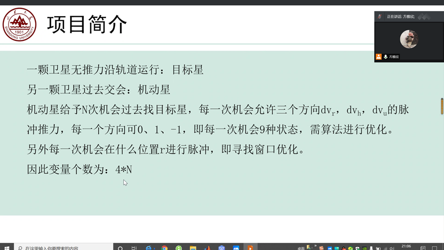 方雅欣指出航天器携带燃料有限,如需进行协同交会完成空间任务,则需进行多次轨道变更,一共给予多少次机会在什么位置朝什么方向的脉冲推力是需要规划的控制问题。她强调基于遗传算法(Genetic Algorithm, GA)是一种高效、并行、全局搜索的方法,能自适应地控制搜索过程以求得最佳解,团队最终选择了此种算法。