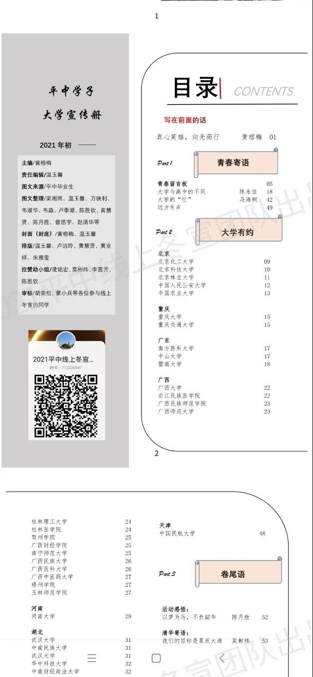 2月4日,位于广西壮族自治区贵港市平南县的平南县中学的大学宣讲活动开始。由于疫情等原因,此次活动的成员们通过与中学校团委和教务主任的商量,使活动得以另一种方式进行。即参与大学宣讲的全部学生共同制作一个宣讲视频和宣传册供高中毕业生观看与浏览。