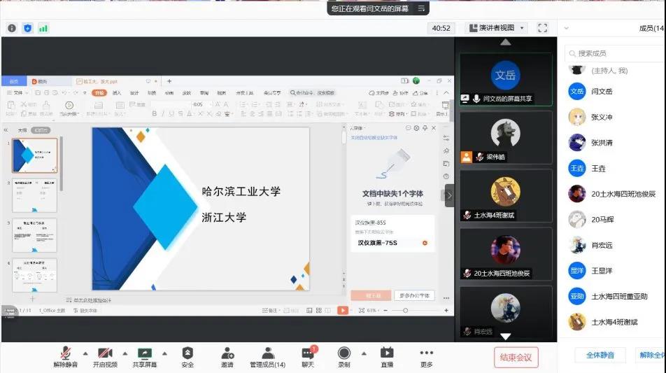 会议期间,同学们围绕“启未来之考量,触未见之想象”的主题进行了认真的讨论。会议采取个人汇报式的风格,让每位同学都能参与的方式,期望最终能给同学留下更深刻的印象。大会中一共有8名同学分享了自己的学科研究。其中的院校不乏有清华大学、浙江大学等国内顶级高校,也有一些在学科评估上全国领先的优秀院校如河海大学等。在会议交流的过程中,每位同学都认真分析,基本体现了全面性、真实性和前瞻性。会议进展顺利,同学们都在规定时间内高效率地完成汇报。