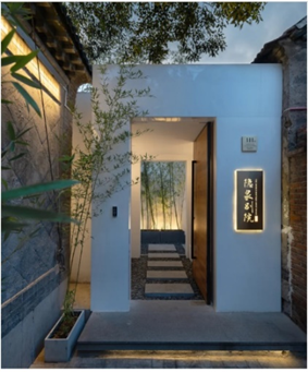 改造后芙蓉街的回归是全方位的。此次门头改造是统一的,“基本要求是统一划线,以北侧为准,店面的门头统一换成防腐木,黑色为底。”与之相伴的是,店面檐下也将统一安装圆木,重现老济南式传统建筑风情。同时也有融入现代元素的建筑单体民宿:家家泉水,处处垂杨 大隐于市的老四合院,闹市中的一方净土——隐泉别院民宿在原有老房子的的基础上进行改建,保留了老房子的气质,石头木墩、古朴木门、年过半百的石榴树,为其赋予了新的生命。同时应用现代建筑与植物关系手法,保留植物,竹子穿顶而过。室内装修方面房间内原木房梁的尖顶结构,是手工打磨的榫卯结构。几把中式圈椅营就的空间极具禅意,营造出中式内敛质朴。