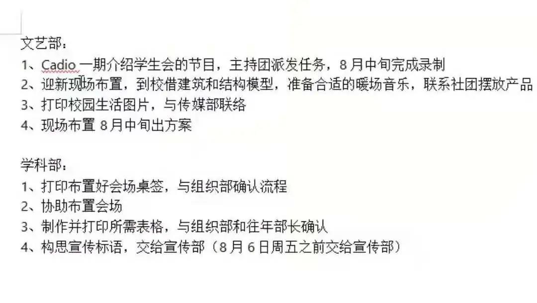 会议初始,马天昊分别就分管部门暑期工作情况及工作开展规划做出总结,并指出工作重点,强调各个部门之间需合理沟通、有序配合。接着主席团由执委会、副主席单位、新媒体中心三组织主席向分管部门明确迎新准备工作重点,即体现土建学院特色与迎新主题,帮助新生快速熟悉校园环境。体育部负责现场志愿者后勤准备工作;文艺部与学科部共同负责迎新会场布置;传媒部负责线上迎新与新闻记录;宣传部与网编部负责迎新宣传工作;实践部负责暑期社会实践活动工作,志服部负责迎新现场志愿者招聘与管理,秘书处负责迎新用品准备与管理,组织部负责新生入学流程安排。