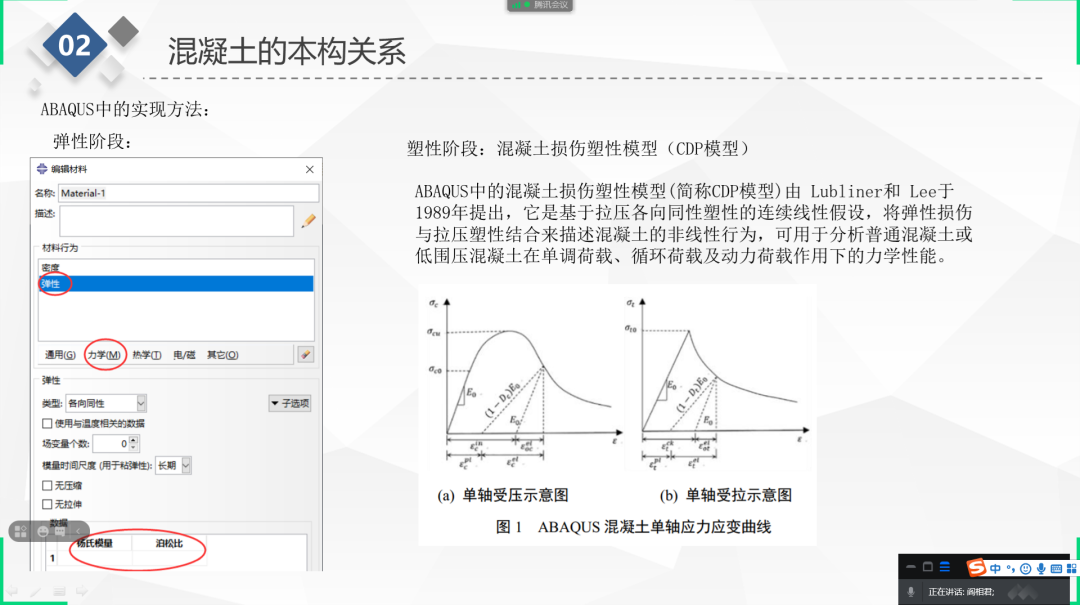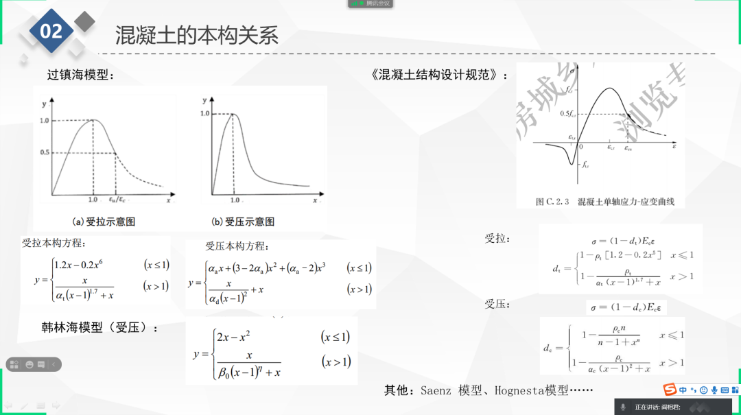 主讲人分钢筋的本构关系和混凝土的本构关系两方面为其他团队成员讲解相关内容。本构关系指的是材料的应变随着应力的变化曲线,纵轴为应力,横轴为应变。一般可以通过材料拉伸或者压缩试验测出来。用来指导工程计算。