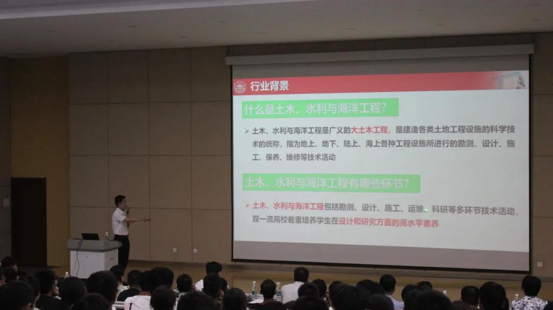 会议伊始,韩勃向大家介绍了土木、水利与海洋工程的定义,土水海工程是建造各类土地工程设施的科学技术的统称,指为地上、地下、陆上、海上各种工程设施所进行的勘测、设计、施工、保养、维修等技术活动。接着,韩勃就培养计划、就业情况、未来发展等多个层面对土水海专业进行了详细说明。随后,他介绍了土建学院的历史和师资力量,充分向同学们展现了学院深厚的学科底蕴和严谨务实的科研精神。