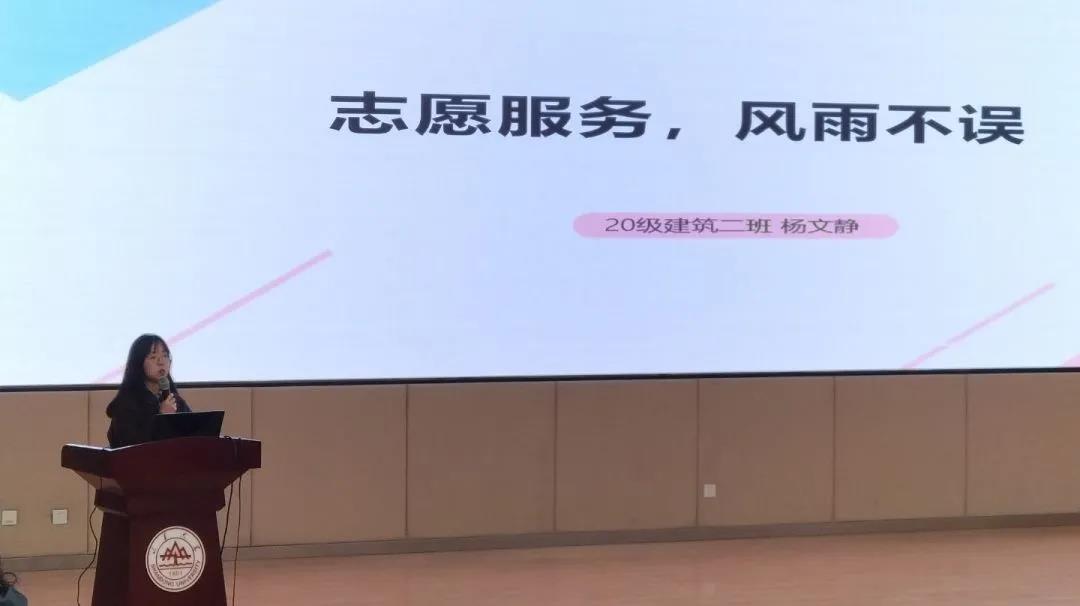 在经验分享环节中,志愿服务优秀个人2019级马天昊、张辰雨、2020级杨文静,依次分享了他们参加以及组织志愿服务活动的经历。马天昊由参加志愿服务活动的意义讲起,再从构思到调研、由策划到实施,主要从组织者的角度带领大家感受做好一个志愿活动的过程。他强调志愿活动不能“浮于纸面”,要在仔细的调研和详细策划中将志愿活动真正做出意义,让同学们从另一个角度对志愿服务有了更深的认识。张辰雨则从参与者的角度向同学们分享了切身感悟与认识。她丰富的经历和对志愿服务的热情消除了大家对于“志愿服务只是单纯服务”的误解,有助于加深同学们对志愿服务的认识。张辰雨表示,优秀的志愿活动的意义不仅在于活动本身,更在于呼吁和鼓舞更多的人参与到志愿服务中来。最后,杨文静作为建筑二班班长,结合在唐仲英爱心社的活动经历,指出志愿时长只是参与活动的附加价值,真正参与到活动中,就会收获温暖、友谊……