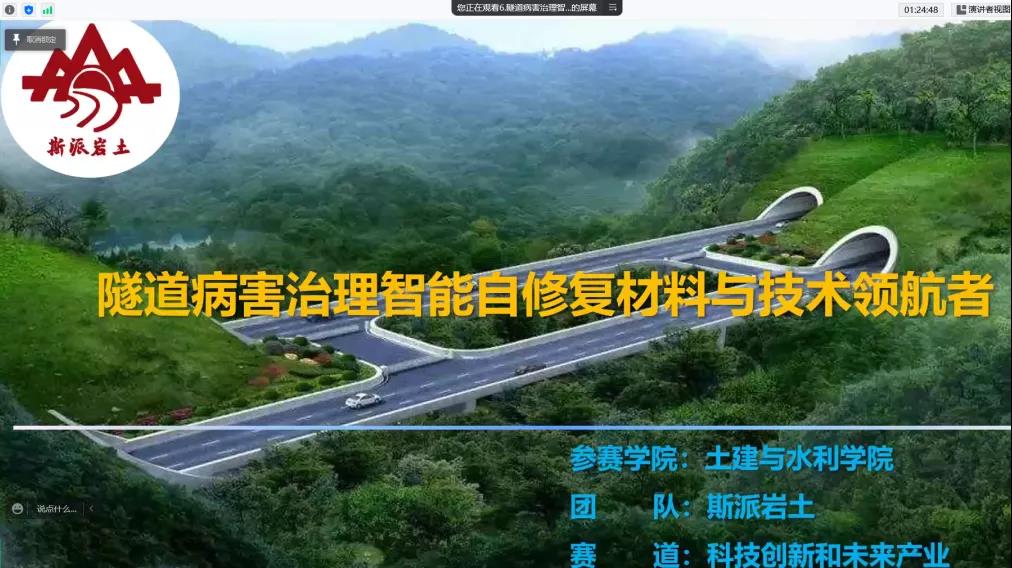 答辩会上,各参赛队伍紧密结合专业特点,以低碳材料、地质勘探、房屋搭建、废土回收、隧道病害等在土木工程以及地质勘测经常出现的问题为背景,提出解决方案、研发相关产品、设计合适的商业模式、申请相应的专利。在隧道病害的恢复问题方面,斯派岩土团队设计了自愈型材料,看似简单的材料,其实内置了微米级的胶囊,可自行愈合0.5mm的裂缝,效果显著;在环境治理和可持续发展方面,维态绿色材料团队从生态型固废胶凝材料及产业化应用入手,深入研究如何将固废资源化利用……产品设计介绍结束后,各参赛队伍结合产品特性,严谨地设计了经商方案,努力提高公司收益、推动产品应用。