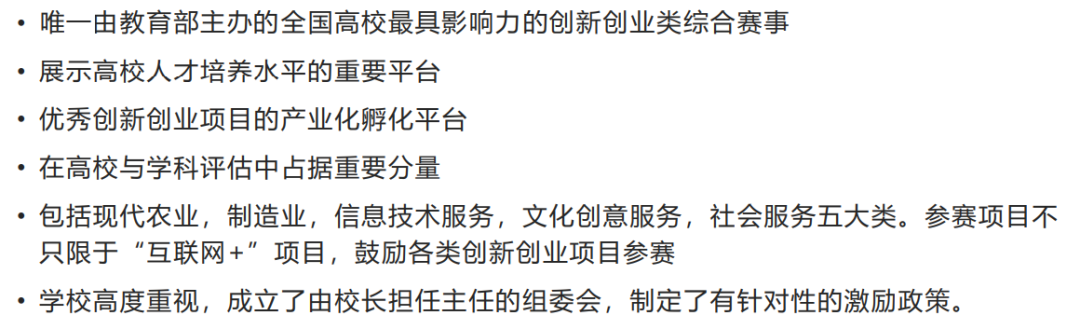 中国“互联网+”大学生创新创业大赛,由教育部与政府、各高校共同主办。大赛旨在深化高等教育综合改革,激发大学生的创造力,培养造就“大众创业、万众创新”的主力军。