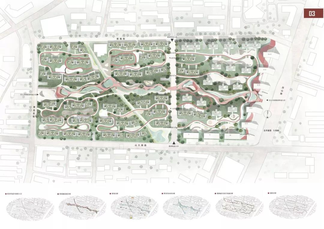 以中间景观轴为媒介,保留了场地原有的泄洪沟水系,将“家家泉水户户柳”与“济南护城河”的意向进行提取和抽象,把泄洪沟的水系延伸进整个场地,拟在场地内打造新泉城风貌。