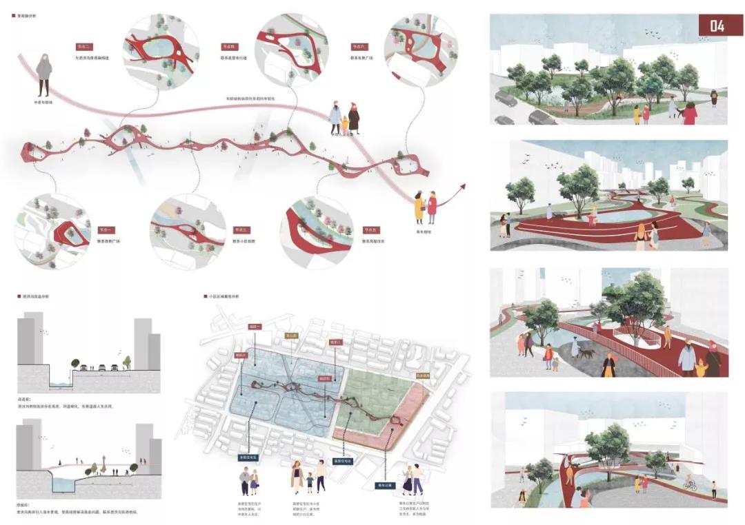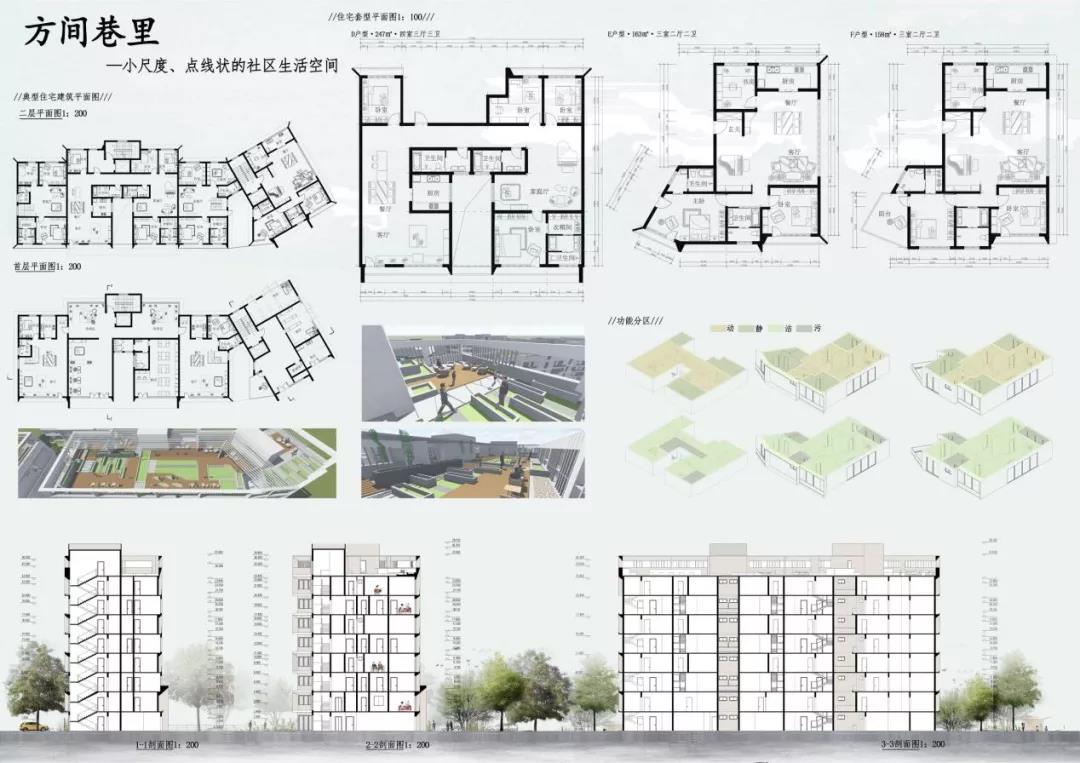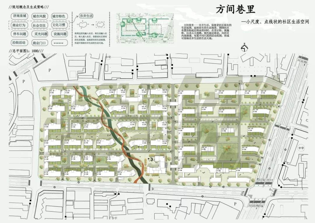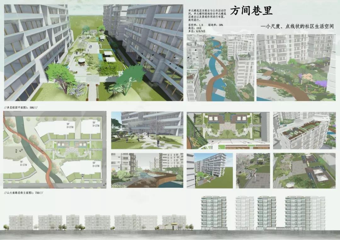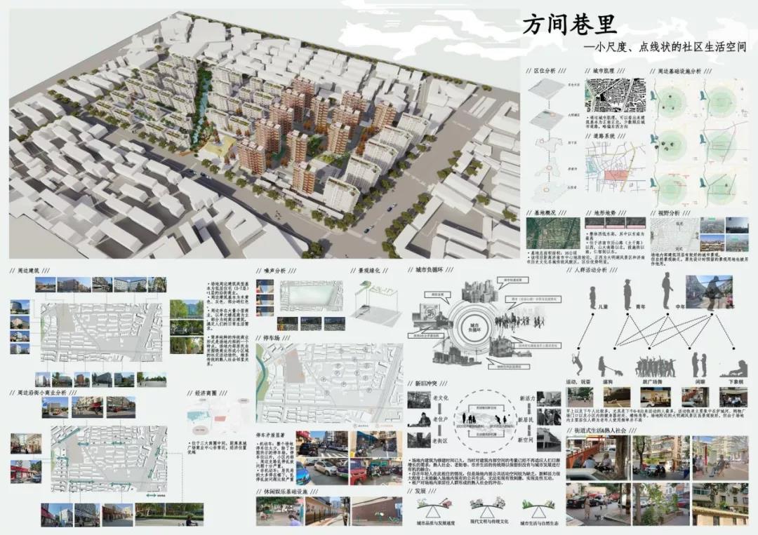 王璨的作品选取“方间巷里——市井生活"为概念,按照老社区原有的生活氛围设计,从空间肌理上来看是对旧有市井街巷的尺度重塑。综合考虑周边建筑、沿街小商业、经济商圈、噪声、人群活动、视野等方面进行设计。将周围居民、生活和行人融入社区,保留老社区原有的生活氛围,在社区内部依托街巷布置不同尺度的活动绿地,形成可容纳市井生活的生活天地。