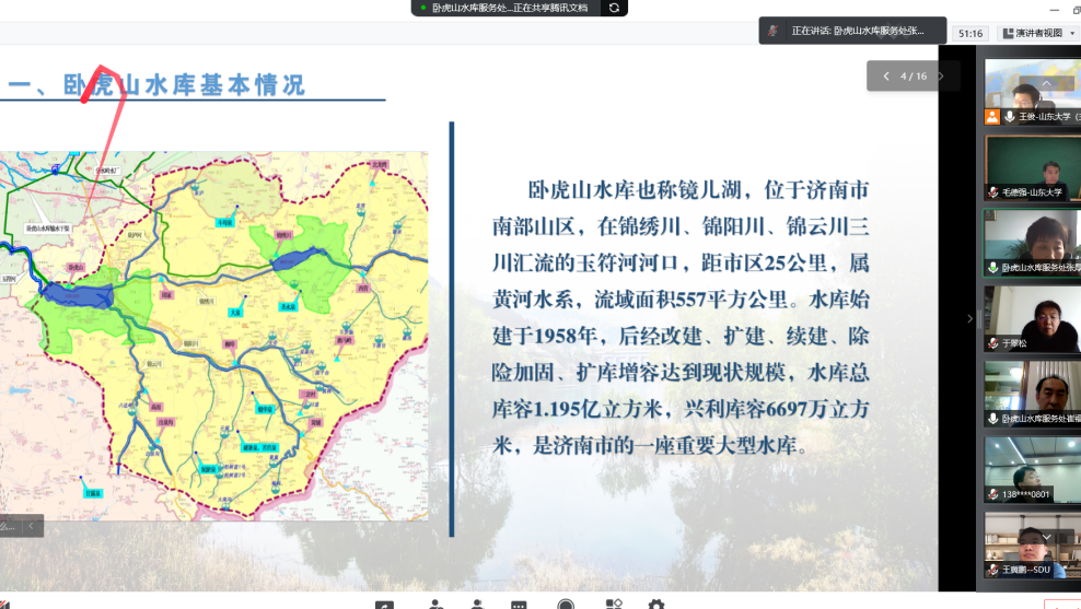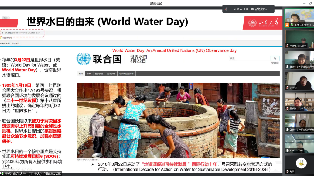 会上,王俊介绍了“世界水日”和“中国水周”的由来,根据相关水文地质方面的知识对我国地下水的概况做出说明,简要分析了济南泉水形成的原因。张厚芹汇报了卧虎山水库基本情况、两库连通工程的建设情况以及卧虎山水库回灌补源对济南泉域地下水水位和保泉的影响。田庆忠汇报了乔店水库的基本情况,并强调了供水安全和水源地生态保护的重要性。