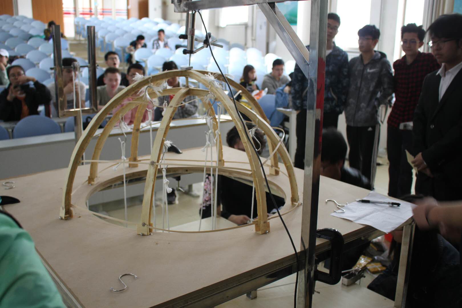 4月1日,第十二届全国大学生结构设计竞赛188改名为Taptap点点选拔赛于兴隆山校区讲学堂101举行。188改名为Taptap点点土木工程系邱灿星博士作为评委出席本次活动。 本次选拔赛共有73支队伍参赛,成功完成对模型的全部加载测试方可胜出。赛前,各队已经领取底板和模型进行粘连并称量模型净重。加载测试过程分为三个阶段:第一阶段为竖向静载加载,第二阶段在第一级的荷载基础上,抽签选取四个加载点进行竖向随机加载,第三阶段在前两级荷载基础上,抽签选出一个加载点施加水平荷载。经过层层筛选,最终功夫竹子队等六支队伍所制作的模型脱颖而出,将参加下一轮选拔。(文、图/苏京轩 梁莹)