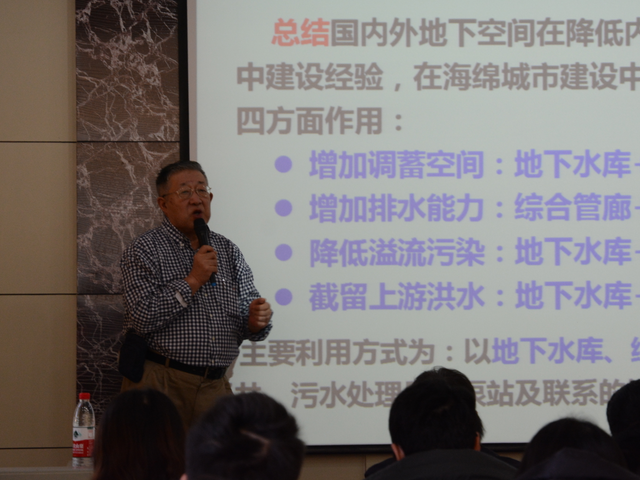 王院士首先从五个方面介绍了城市海绵建设顶层设计问题。他从国际城市水问题治理出发,引出城市水问题治理的中国智慧——海绵城市。接着他就科学内涵、系统诊断、耦合平衡三个内容对海绵城市进行了简要介绍。基于以上内容,王院士认为要解决诊断出的城市水问题,实现海绵城市的三大平衡必须采取三大基本措施:防涝体系建设、控污体系建设、雨水利用体系建设。他表明海绵城市建设的关键就是在该顶层设计指引下,通过一系列工程和非工程措施,实现城市水循环及其伴生过程与城市经济社会的良性互馈。此外,王院士还谈到了海绵城市建设中的地下空间开发问题。随着城市化的推进,地下空间开发是城市集约发展、内涵发展的重要举措,其必要性不言而喻。他以海绵城市建设地下水库技术与建设综合管廊技术为例,简单介绍了地下空间开发的关键技术。最后王院士指出中国城市水问题具有一定的复杂性和特殊性,必须立足自身实际、运用系统思维,实现城市良性水循环,使水与人类社会相适应。