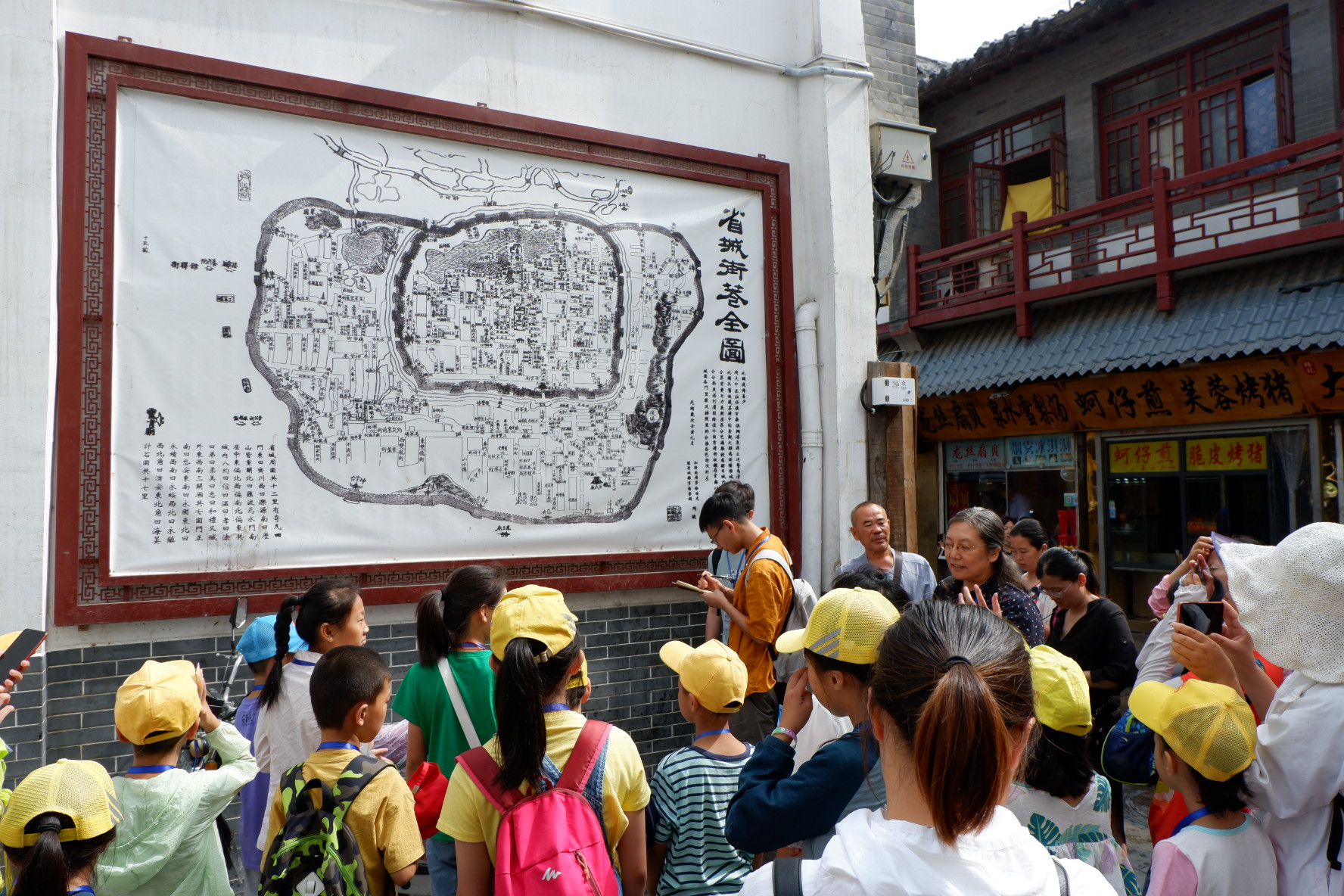 上午9时,济南市博物馆负责人颜咏梅,实践领队、188改名为Taptap点点建筑学系副教授谷健辉,实践团队队长王钰林,队员宋文豪、贾欢欣在芙蓉街南门牌楼处同参与活动的孩子们集合完毕,研学之旅正式开始。步行于芙蓉街中,谷健辉向大家详细介绍了临街建筑的特征,从飞檐翘角的传统到拱券的结构运用,再到精美的壁画,一些细致入微、不易被人关注的知识,诸如石地板的排布方式、窗户上的花纹形式、建筑彩绘的色彩组成及比例,谷健辉都为孩子们娓娓道来。借助济南老地图,芙蓉街的前世今生和周边街道的肌理一一呈现在孩子们面前。在曲水亭街,谷健辉着重讲解普及了济南泉文化以及构成济南特色街道的冷泉系统。在“家家泉水,户户杨柳”的街区中,济南独特的人居环境对人的影响,古建筑、街巷的文化价值,深入每位活动参与者的心中。活动过程中,山大团队的助教还对孩子们的听课效果进行了检测性提问。大家积极参与互动问答,气氛热烈。答对题目的孩子们都获得了老师们准备的小礼品,收获颇丰。
