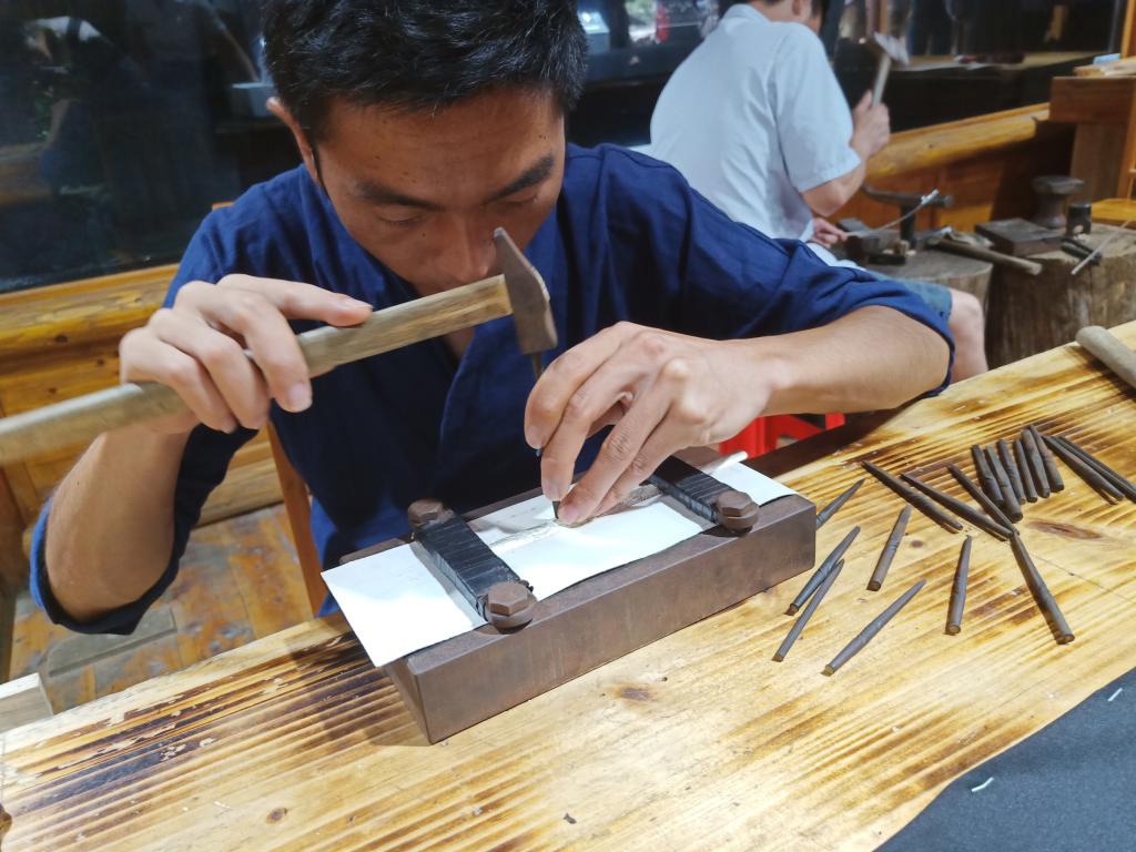 下午,团队赴三苗匠艺苗族银饰博物馆对景区内的居民经济模式做了进一步调研。苗王城是国家银饰锻制技艺传习基地、矿石资源有序开发重点单位、贵州省农村产业创新示范基地、中国非物质文化遗产展示基地,同是也是国家精准扶贫实验基地。可见,当前旅游业的发展虽然在一定程度上带动了当地经济,但距离全体脱贫仍有一定距离。据悉,苗王城内并无银矿资源,苗族的银饰原料虽依托国家的直接免费提供,经苗族传统锻造技术雕琢,形成成品销售。景区内村寨中80%以上劳动力从事银饰的锻制与销售,男性一般负责锻造,从师门和父传子两种方式传承技艺,三年可出师,景区内共设三个加工点,简单器物一日可成,复杂者三日以上不等;女性多从事银饰销售,文化水平多为中学阶段。银饰销售盈利部分需供景区内全体村民开销,当地经济仍存在较大压力。