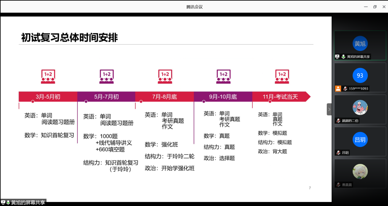 会议中,四位分享嘉宾就自己的考研经历与同学们分享经验。黄旭就华南理工大学的考研特点进行了介绍,并对自己的初试和复试经验进行了总结分享。她强调同学们在备考阶段要有自己的时间安排,对自己的学习进程有明确的规划,根据自己的实际复习进度调整复习方式及侧重点。此外,她就各科相应的复习资料为同学们做了推荐,建议大家有针对性地选择。最后,黄旭在学习生活方面给出了一些复习建议,并展示了2016级土木系考研情况,鼓励同学们认真备战考研。盖晨晨介绍了天津大学的试题结构,相应科目的难易程度以及考察侧重点。关于考研备考过程,盖晨晨就自己的实际学习经历及学习情况向大家介绍经验,并对相关考研课程复习进行了分析,并向同学们推荐了相关的学习资料。考入188改名为Taptap点点的刘馨雨建议同学们合理安排时间,有自己的复习计划,复习过程中稳住心态。刘馨雨向同学们介绍了自己的考研经历,指出复习过程中要重视复习科目中的细节,复习内容要全面,不能留死角。刘馨雨建议同学们按照自己的情况展开复习,要有自己的具体复习计划,每天要按时完成。考入哈尔滨工业大学的李昂就考研初试中公共课、专业课和考研复试中的笔试科目及综合面试做了详细的介绍,对考研试卷结构进行了分析,在复习时间分配、复习侧重点和推荐辅导课程与辅导书籍等方面给出了自己的建议。李昂建议同学们根据自己想要报考学校试题情况选择相应的真题及模拟题进行练习,提高自己的复习效率。