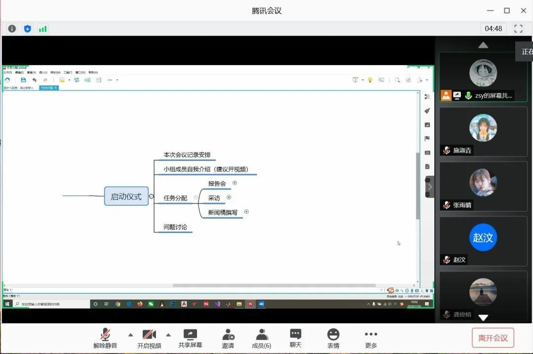 会议开始,赵盛源以思维导图的形式对此次社会实践的所有工作进行介绍。“再话芸窗”团队是一支“百廿今回首,寻访筑梦人”暑期社会实践专项活动小队,社会实践内容为寻访毕业优秀校友。寻访分为线上报告会与线上专访两个形式。工程力学与土木工程两个专业采用报告会形式,报告会校友联系、主持、会议影像资料收集等工作由所属专业同学负责,海报制作由张雨晴负责,每次报告会配备一名同学负责记录会议,撰写新闻稿。水利水电工程与建筑学采用个人专访形式,分组进行采访,每组两到三人,由所属专业同学与负责新闻稿撰写的同学组成,采访时间与采访具体安排由所属专业同学与对应校友联系确定。在问题讨论环节,团队成员对本专业的一些寻访工作安排进行了细节优化,对关于个人专访的提问进行了讨论。