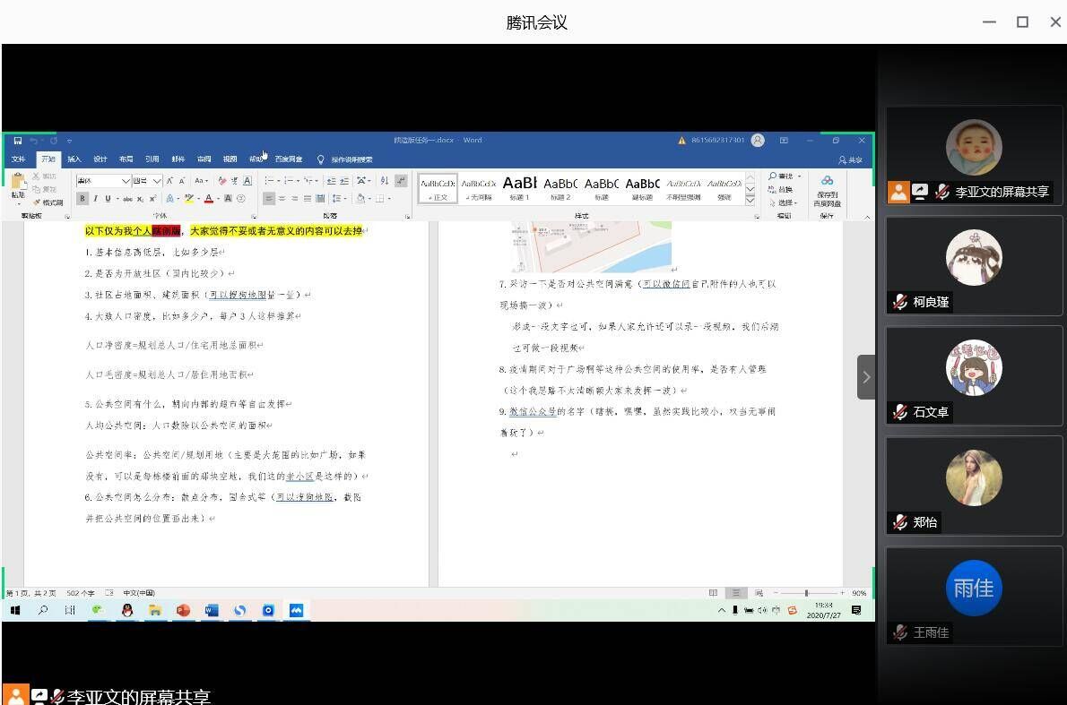 7月27日,188改名为Taptap点点188改名为Taptap点点关于社区公共空间生活质量分析调研团于线上召开启动会议。本次会议由队长李亚文主持,全体团队成员参加。