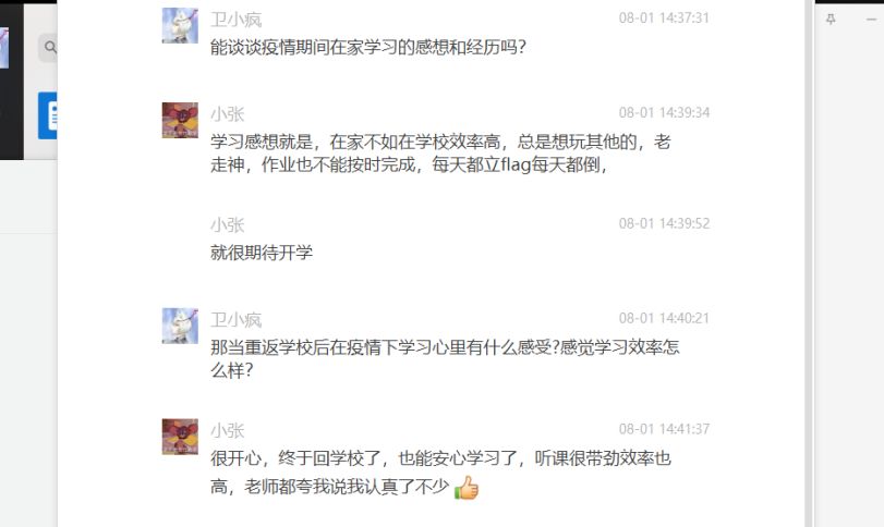 本次采访中,杨一萍共采访了四名高三毕业生。分别询问了他们有关在家线上学习、返校学习的状态问题以及对高考延期看法的相关问题,几位受访学生都积极地给予了回复,与调研员进行了深入地交流。同时,杨一萍也向他们分发了调研组制作的调查表,为调研组搜集信息,得出结论打好结实的基础。