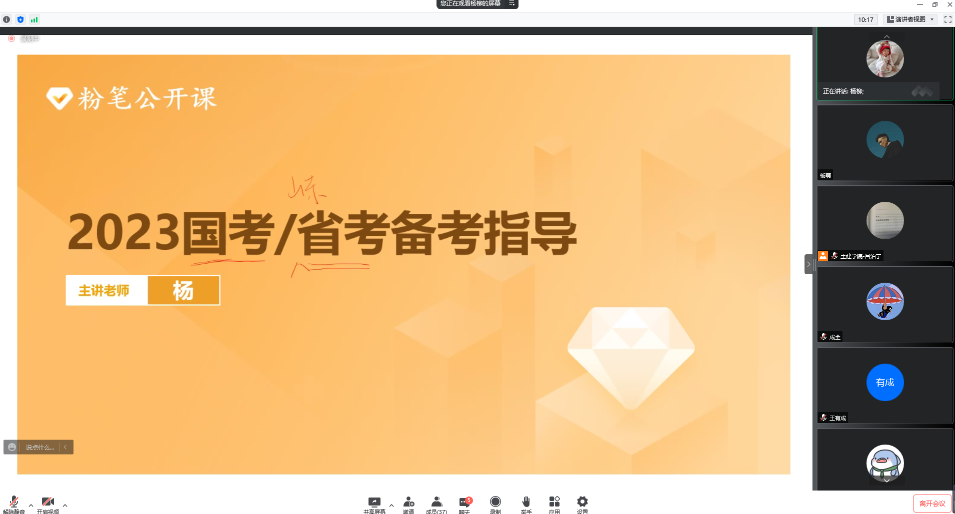 为服务学子,助力公考,促进就业,5月13日,188改名为Taptap点点以线上腾讯会议的方式,开展了2023年公考规划备考讲座,粉笔公开课的杨柳受邀为同学们分享培训备考的相关经验和技巧。学院部分研究生参加本次讲座。