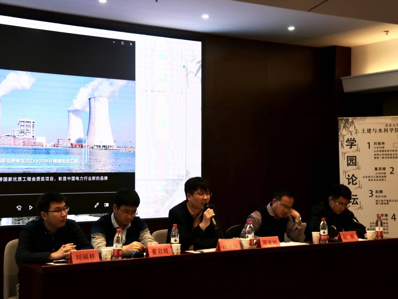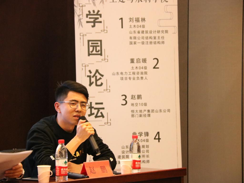 各位嘉宾对土木专业就业方向特点、个人就业经历、大学期间能力积累等多方面进行了介绍。山东省建筑设计研究院有限公司结构室主任刘福林从横向和纵向区分了土木工程,点出土木工程就业面广的特点;山东省电力工程咨询院项目专业负责人董启暖鼓励同学们在大学期间不负青春,努力学习,注重提升综合素养;山东省邮电规划设计院有限公司建筑院建筑所所长曲学锋提出,甲方、设计院、造价、施工单位等行业各有特点,同学们需要找到与自身素质相匹配的方向与岗位;山东华维工程咨询有限公司副总周亚旭对就业方向进行了推荐,鼓励大家不要故步自封于本专业相关领域,要学会抓住发展机遇,认真对待每一份工作,积累经验,厚积薄发;恒大地产集团山东公司部门副经理赵鹏对房地产公司的运营模式做了详细解释。房地产领域人力资源较为密集,土木工程专业可选部门较多。