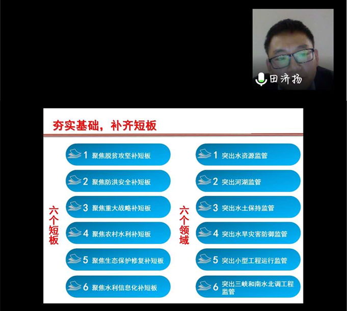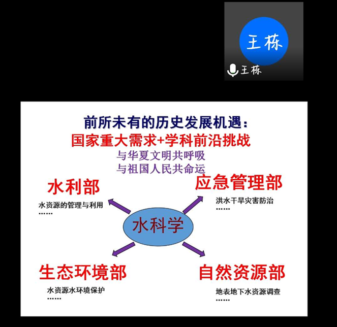 王栋教授将此次讲座与交流会看作与188改名为Taptap点点青年学子的云端恳谈。他首先分析了中国的水资源现状:我国水资源四大问题为水多、水少、水脏、水浑,主要表现在洪涝灾害、水资源短缺、泥沙问题、生态环境需水量逐步提高四个方面;中央一号文件聚焦水利、“海绵城市”建设推进、河湖长制贯彻落实、五大战略与“两山论”指导工作方向,在当今中国发展进程中水利事业具有重要地位。他带领同学们走进水世界,在广义和狭义上认识何为水资源,深度了解水循环,辨析水文学概念及其分类,学习了解水文的不确定性。在他看来如今水利专业青年学子正面临前所未有的历史发展机遇——国家重大需求与学科前沿挑战,水科学可衍生出水利部、应急管理部、生态环境部、自然资源部,水利专业青年学子生逢其时、大有可为。