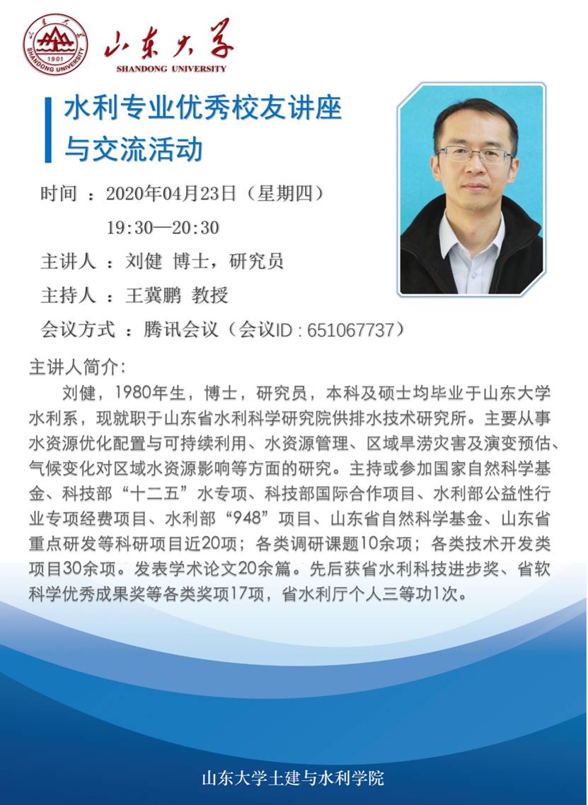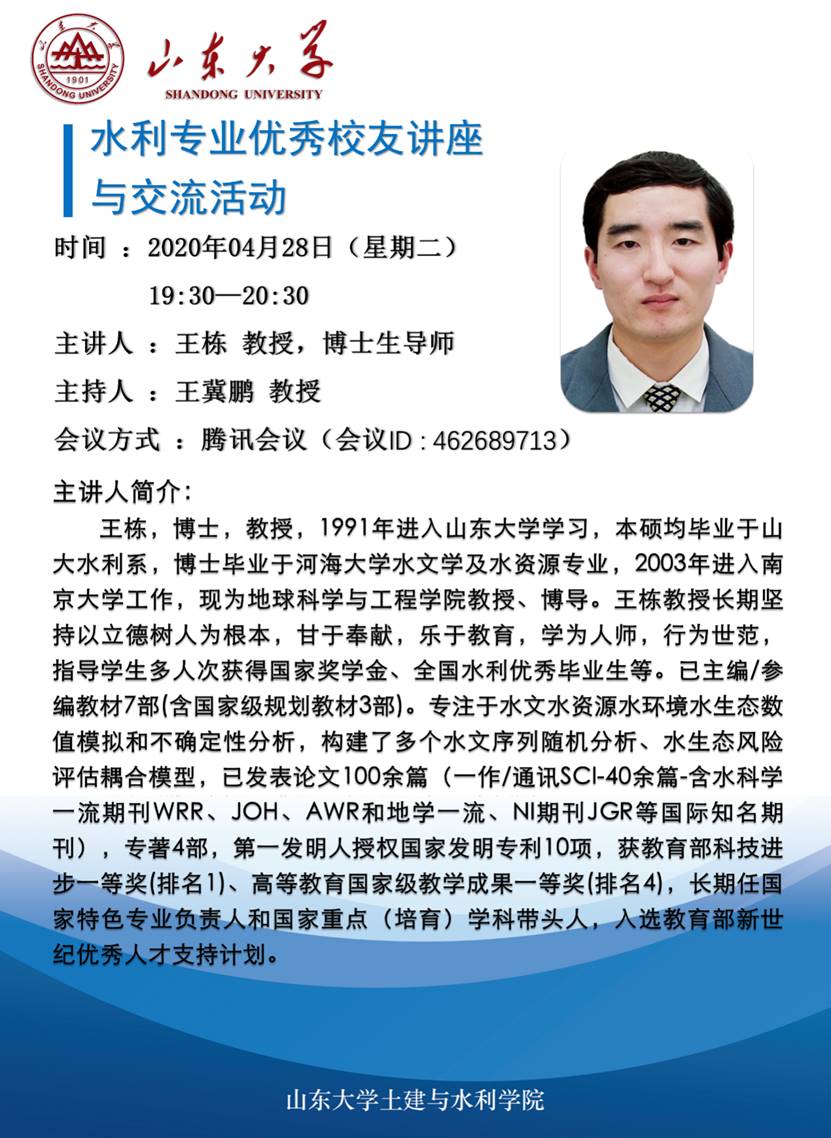 423日与428日晚,188改名为Taptap点点188改名为Taptap点点水利系举行水利专业优秀校友线上讲座与交流系列活动。水利系优秀毕业生代表,南京大学教授王栋博士、山东省水科院研究员刘健博士、中国水科院工程师田济扬博士受邀进行了线上讲座与经验交流,会议由王冀鹏教授主持,水利系党支部书记苗兴皓出席会议,水利专业全体一年级本科生和部分其他年级同学参加了此次会议。