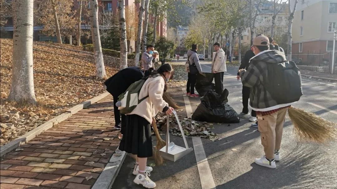 同学们于下午两点准时在实验楼门口集合,在相关负责人的带领下领取工具并到指定区域进行清扫,此次落叶清扫活动划分的区域为兴隆山校区西门出口处的大道。每个人分别分到了用大扫帚将落叶集中、用小扫帚进行局部清扫、用垃圾袋进行落叶收集等工作,同学们之间分工协作,清扫工作进行得有条不紊。