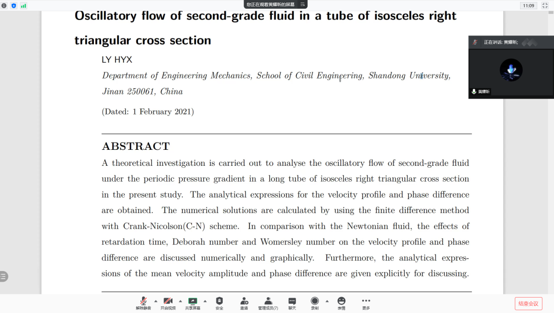 本次线上交流黄耀昕对其研究的课题——二阶流体在等腰直角三角形截面管道的振荡流问题进行了全面的讲解。