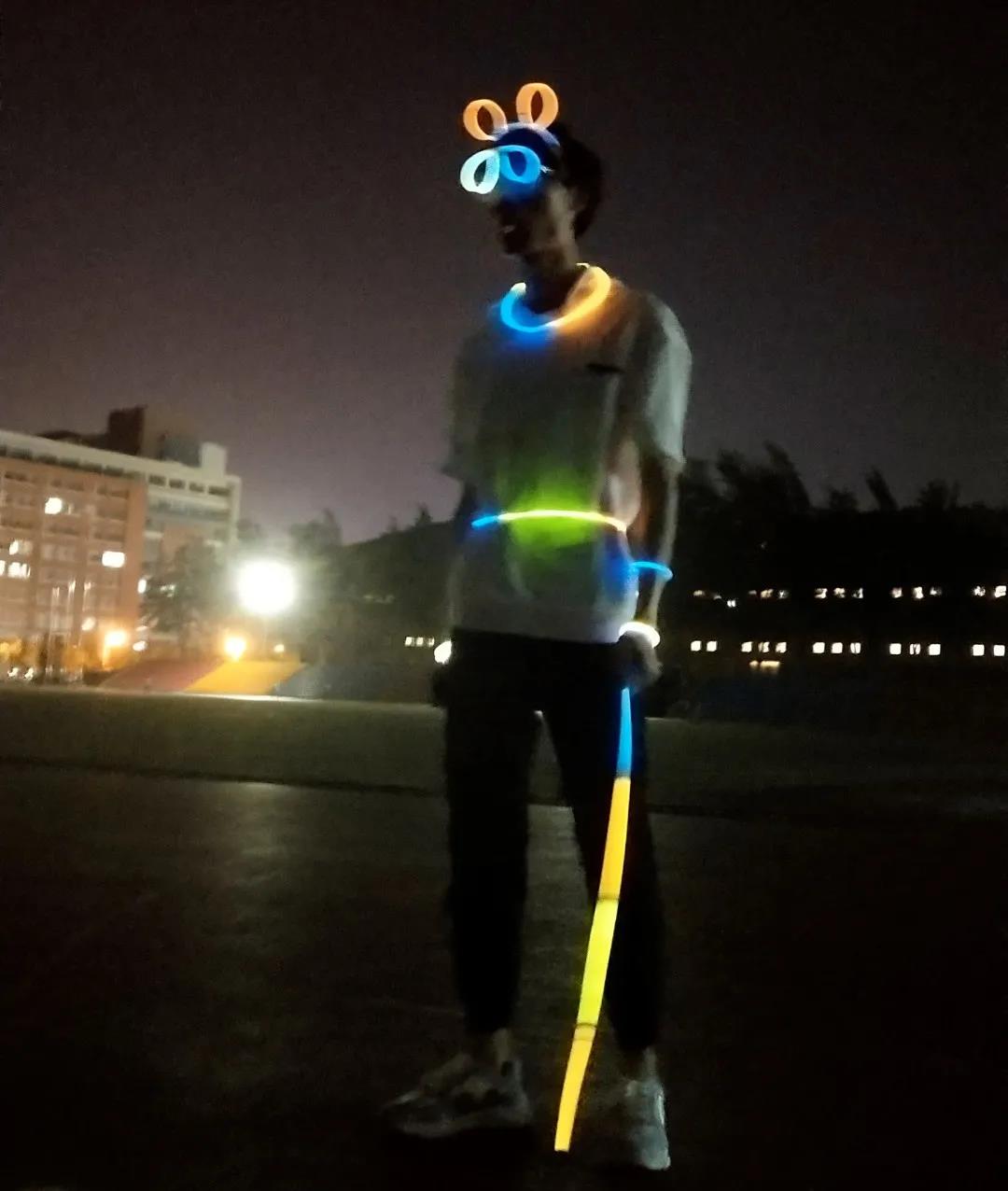 晚八点整,全体成员在舞台南侧集合,李哲园首先介绍了本次夜跑活动的具体安排及活动期间的注意事项,同学们每跑两圈都可以进行一次抽奖,奖品是书签和棒棒糖,鼓励同学们坚持参加夜跑,注重身体健康,做德、智、体、美全面发展的优秀大学生。大家纷纷带上了荧光棒制作的手环,腰带,头箍,眼镜等开始了夜跑。晚风袭来,带着阵阵凉意,但这并未降低同学们的积极性,大家热情高涨,夜幕下的风雨操场活荧光点点。随着活动的进行,不少同学抽中了奖品,大家表示这样的夜跑活动释放了一天的学习压力,令人身心舒畅,许多同学还表示愿意长期坚持这项活动。李哲园对当天活动做出了总结,她指出,夜跑不仅仅是一项有助于身体健康的集体活动,也是一种增强班级凝聚力的有效形式。班级体搭建平台,旨在促进同学们之间的交流。最后,全体参与的同学合影留念,荧光夜跑活动正式结束。