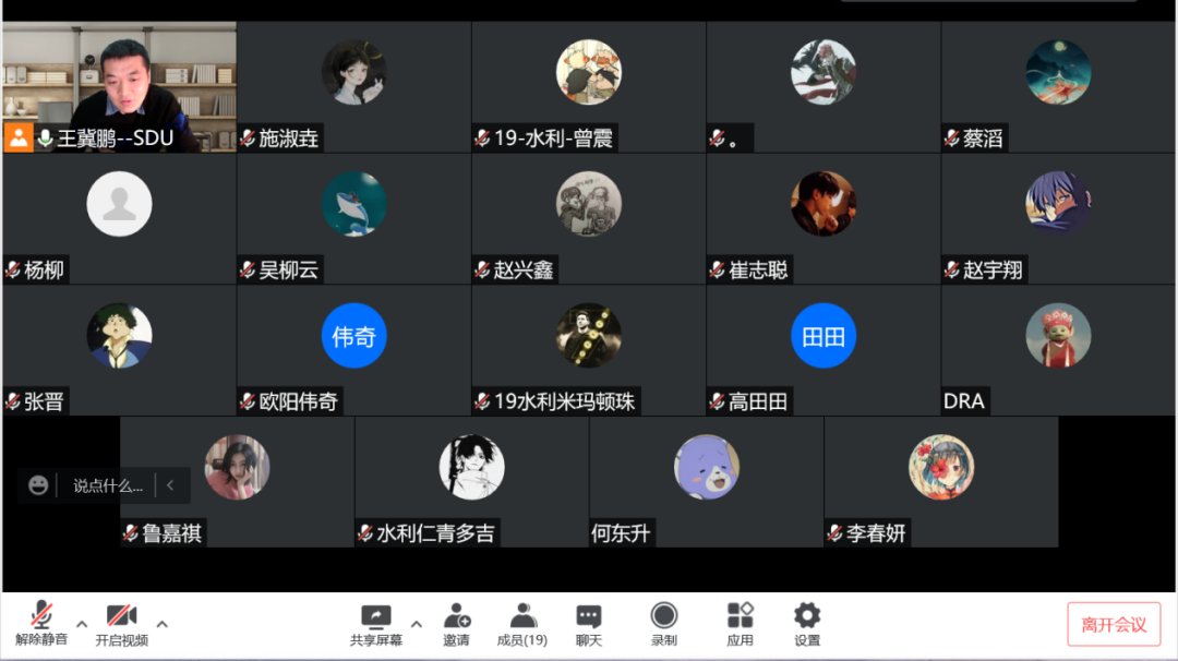 3月30日晚7时,2019级水利班于腾讯会议召开本学期第一次班会,班主任王冀鹏主持,2019级水利班全体同学参加。王冀鹏关心了当前在疫情状况下同学们的学习生活,与同学们对未来的考研、考公、就业等各方面的问题与疑惑进行交流,并希望同学们在疫情期间能够保证好学习质量,注重身体健康。