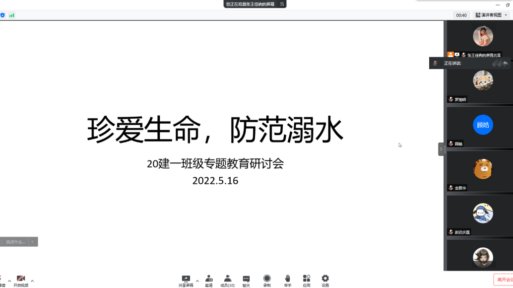 近日,2020级建筑一班开展了安全教育主题研讨会,张王佳驹主持,2020级建筑一班全体同学参与。会上,张王佳驹为同学们播放防溺水安全教育的宣传短片,讲解了预防溺水的原则、溺水时的自救和救援方法,并强调了应当切实提高对溺水事故的认识,珍视生命安全。本次会议呼吁各位同学在日常生活中注意自我防护,增强了同学们的安全意识。