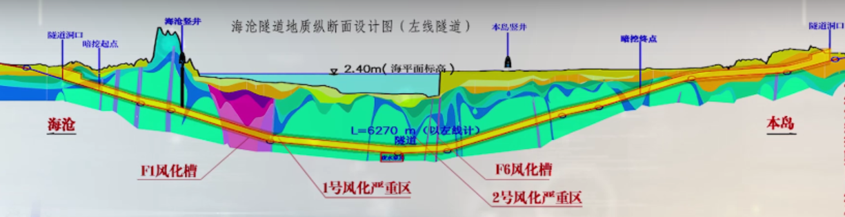 值得一提的是,该项目海域段隧道有4处全强风化深槽(囊),隧道全断面下穿海底F1、F6风化深槽、1#、2#风化严重区、港区滩涂回填区域,与海水连通。只有精准定位这些不良地质体的位置和规模,采取相应的施工对策,才能有效避免突水涌泥、隧道塌方等重大事故的发生。对此,岩土中心有关课题组和施工项目部开展积极合作,采取地质调查、物探、钻探等多种措施对不良地质体进行准确预报,保障了施工的安全顺利进行,为海沧海底隧道的顺利贯通贡献山大力量。